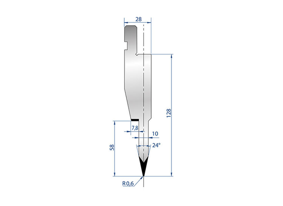 24° büküm açısı, özellikle dar ve keskin form gerektiren parçalarda kontrollü büküm imkânı sunarken, 128 mm kalıp yüksekliği servo abkant pres makineleri ile tam uyumluluk sağlar. 0,6 mm uç yarıçapı, sac yüzeyinde minimum iz bıakarak hassas ve temiz bükümler elde edilmesine yardımcı olur.